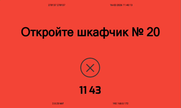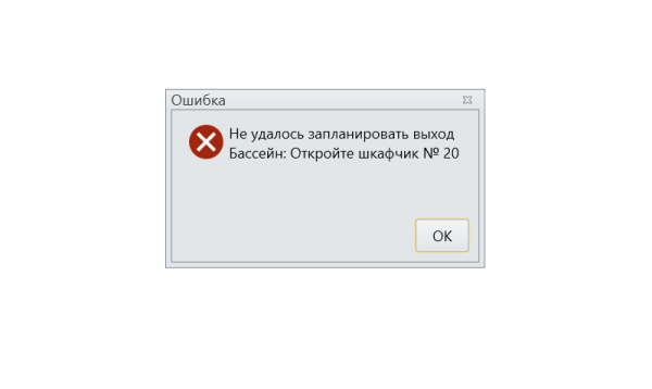 - НО: если посетитель при уходе закрыл шкафчик, то на выходе, после того как будет приложен браслет к валидатору или при гашении долгов на кассе/автокассе, на экране появится сообщение «Не удалось запланировать выход. Откройте шкафчик № 20» (текст примерный, его можно редактировать в разделе «Редактор сообщений турникета» в административной панели)