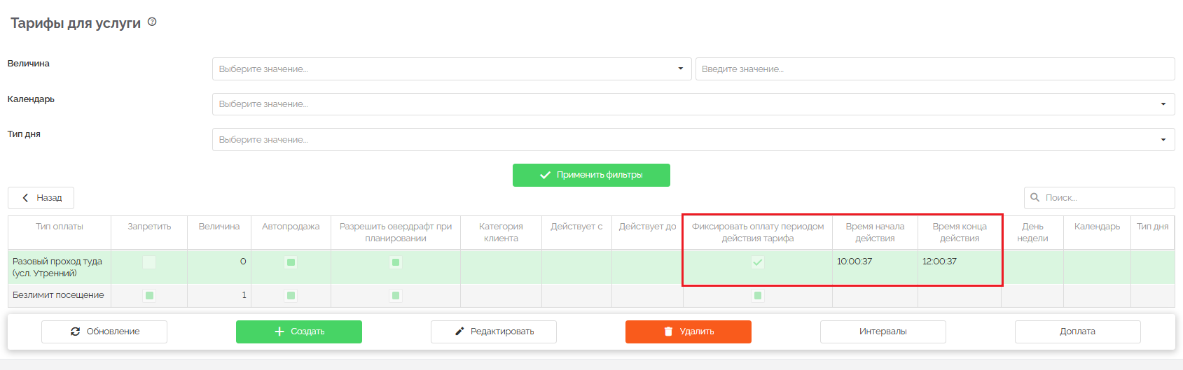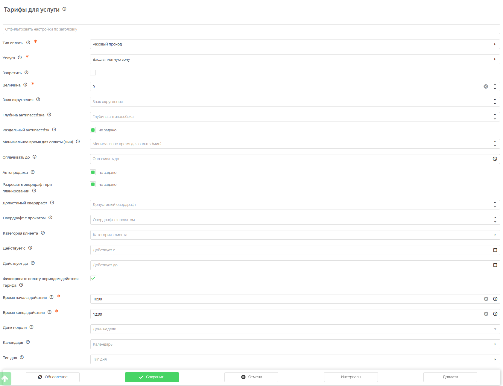 Настройка интервалов для тарифа - временные рамки, по которым будет браться оплата.