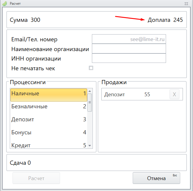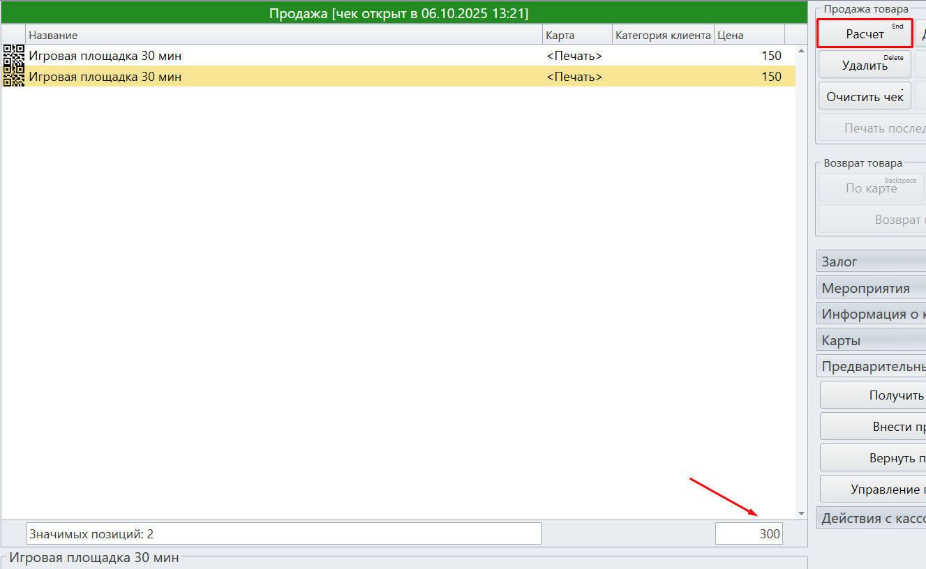 После того как выбран способ оплаты, для продажи товара нажмите кнопку Расчет в левом нижнем углу, либо нажать Enter на клавиатуре.