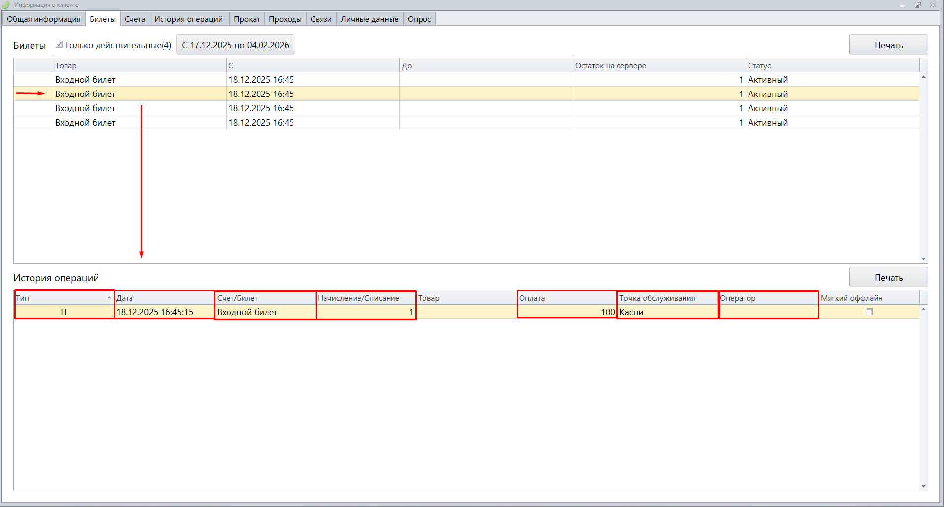 2. История операций по выбранному билету. В данной таблице отображается история покупки билета, его возврата и использования. Выберите билет в таблице «Билеты», и откроется информация по данному билету.