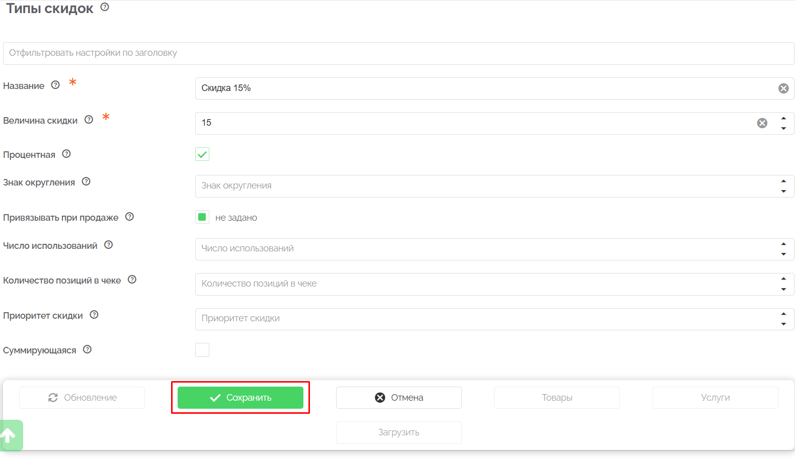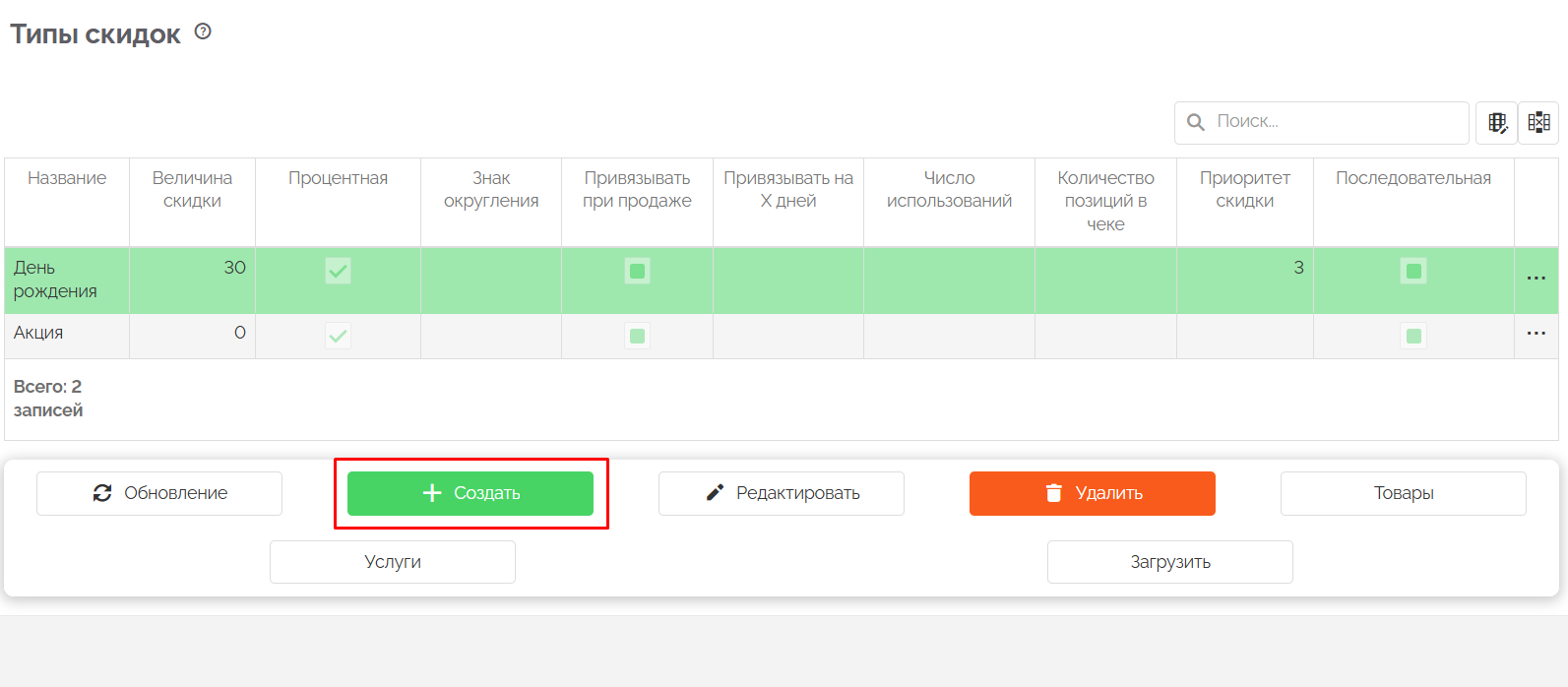 1. Настраиваем скидку в инсталляции в пункте «Товары» → «Типы скидок» нажимаем «Создать»