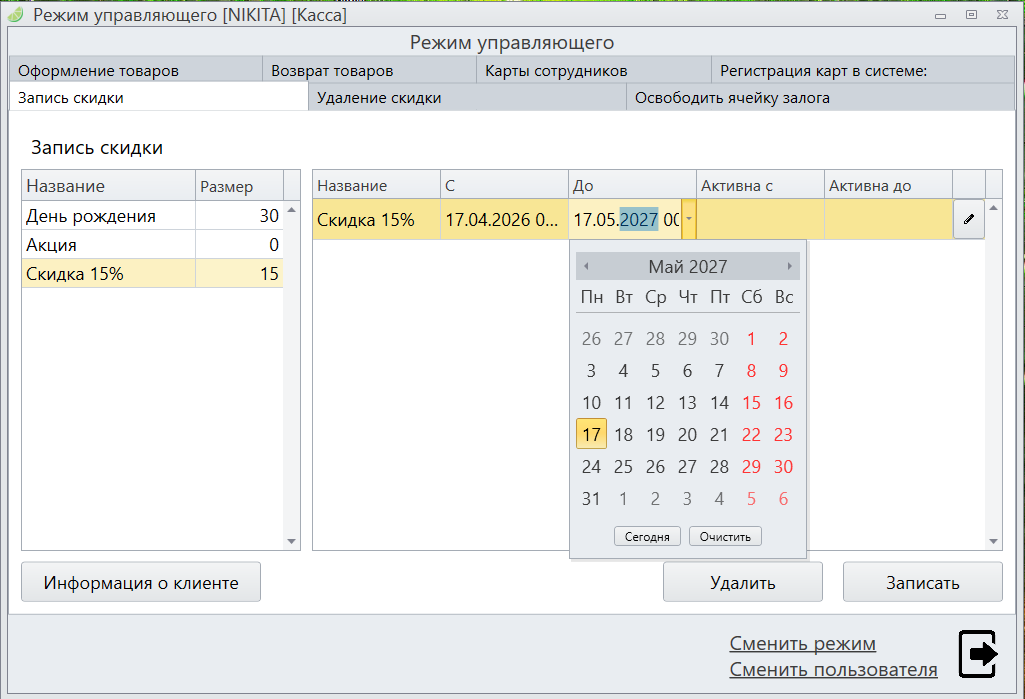 4. Переходим во вкладку «Запись скидки», двойным кликом мыши выбираем в левом окне «скидка 15%» ,справа редактируем интервал действия скидки ,