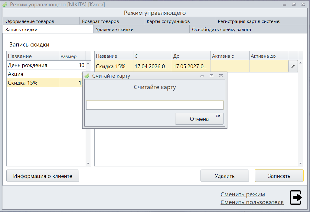 5. Нажимаем «Записать» , на считывающее устройство прикладываем чистую карту (можем пометить ее она у нас будет бонусная 15% скидка(данную карту на период существования скидки нельзя будет использовать по другим назначениям)