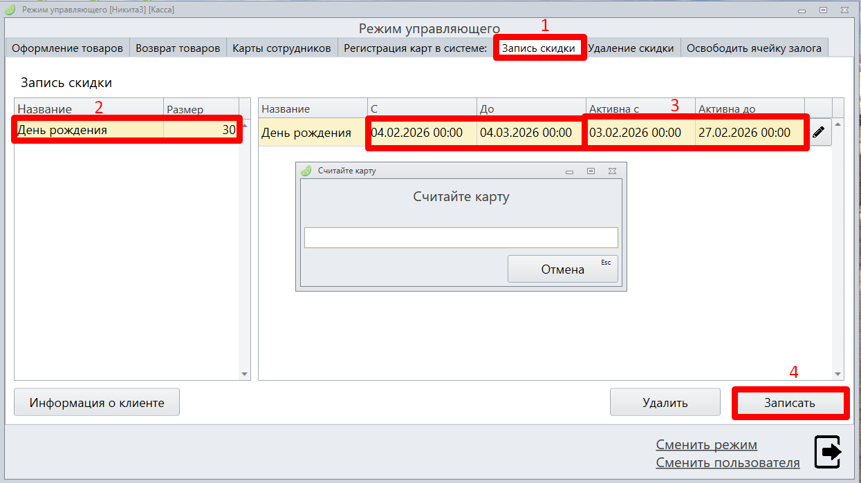 Записать скидку можно через режим управляющего, а также через админ. панель. Для этого нужно: