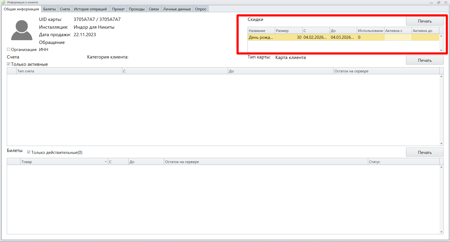 Теперь по данной карте будут применяться скидки на товары в кассе и при проходе на услуги.