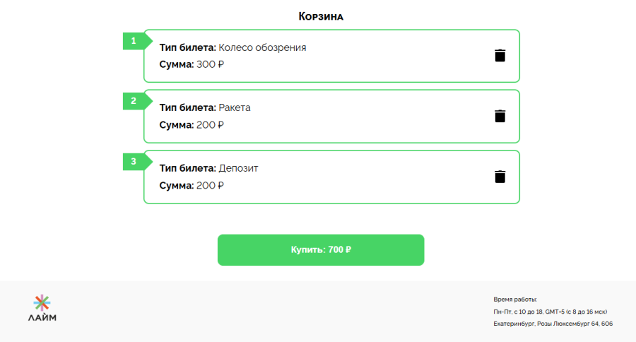 Билеты и сумма депозита попадают в корзину. При необходимости лишние товары можно удалить.