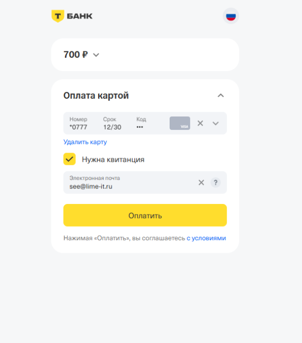 - Нажмите кнопку «Купить». Откроется форма оплаты партнера сервиса «Т-Банк» (возможно использование других эквайеров, о настройке подробнее тут).