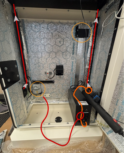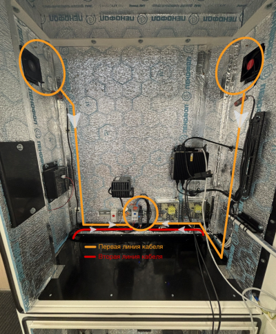 - схема прокладки (с указанием направления прокладки) кабеля питания от вентиляторов к блоку питания HDR 15-12.
