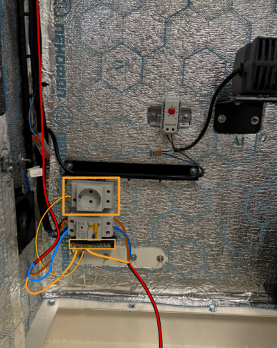 Жирная оранжевая линия — это силовой кабель (трёхжильный кабель, который в нижней части подключается к автомату в общий пучок проводов; заземление выводится на шину). В верхней части автокассы в данном конкретном примере заземление не потребовалось, поэтому используются только провод «+» и «–».