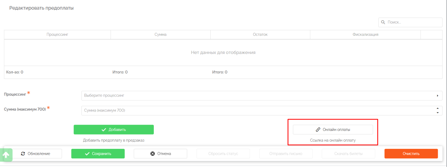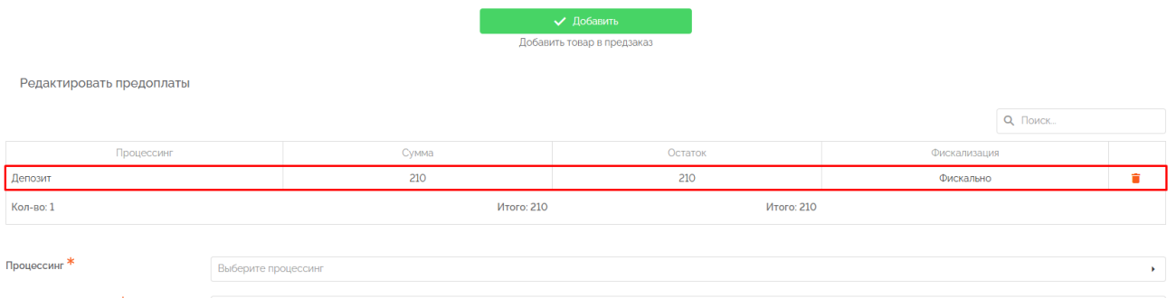 Для редактирования суммы предварительной оплаты нажмите на карандаш у процессинга.
