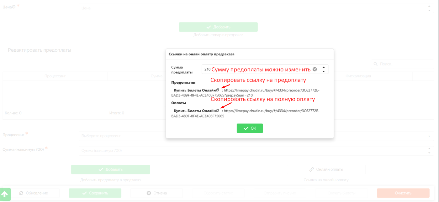 В открывшемся окне будут сформированы ссылки на предоплату и на полную оплату предзаказа.