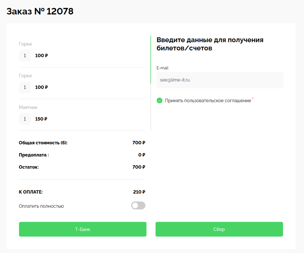 Клиент заполняет адрес электронной почты, если он не был заполнен администратором при создании предзаказа, клиент может выбрать «Оплатить полностью» для полной оплаты предзаказа.