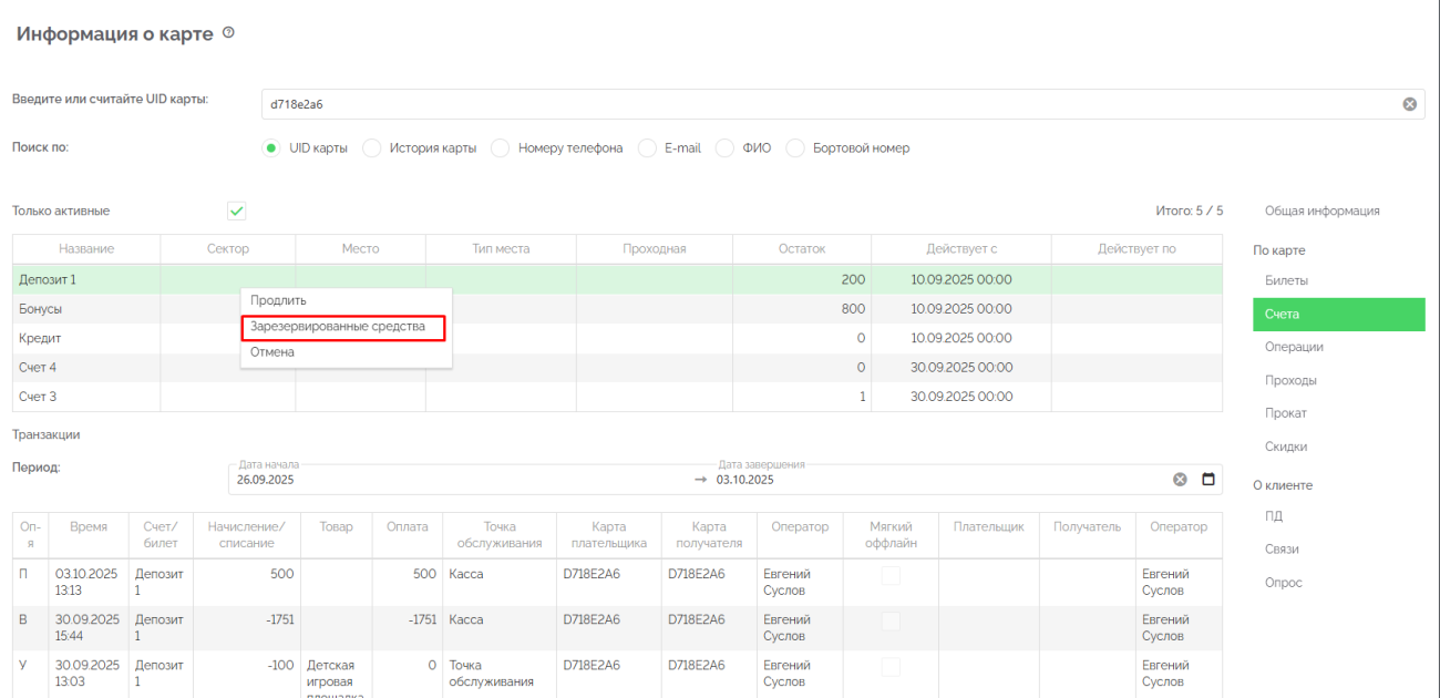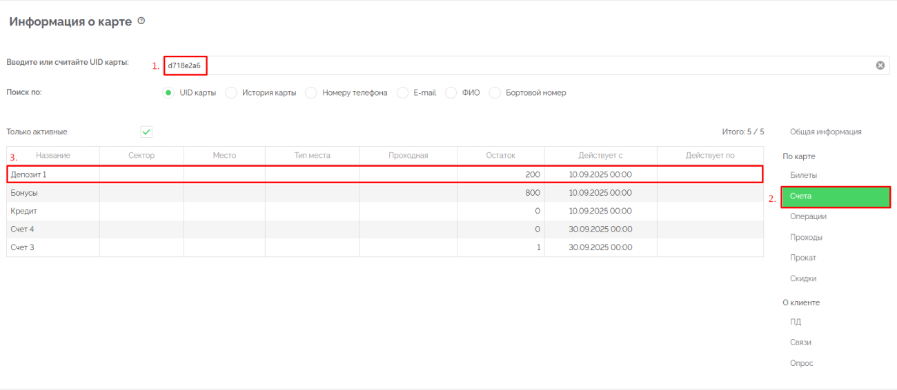 - Далее нужно выполнить поиск клиента по UID карты или др.