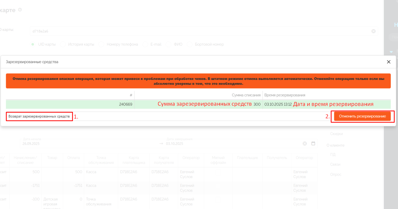 Отмена резервирования опасная операция, которая может привести к проблемам при обработке чеков. В штатном режиме отмена выполняется автоматически. Отменяйте операцию только если вы абсолютно уверены в том, что это необходимо.