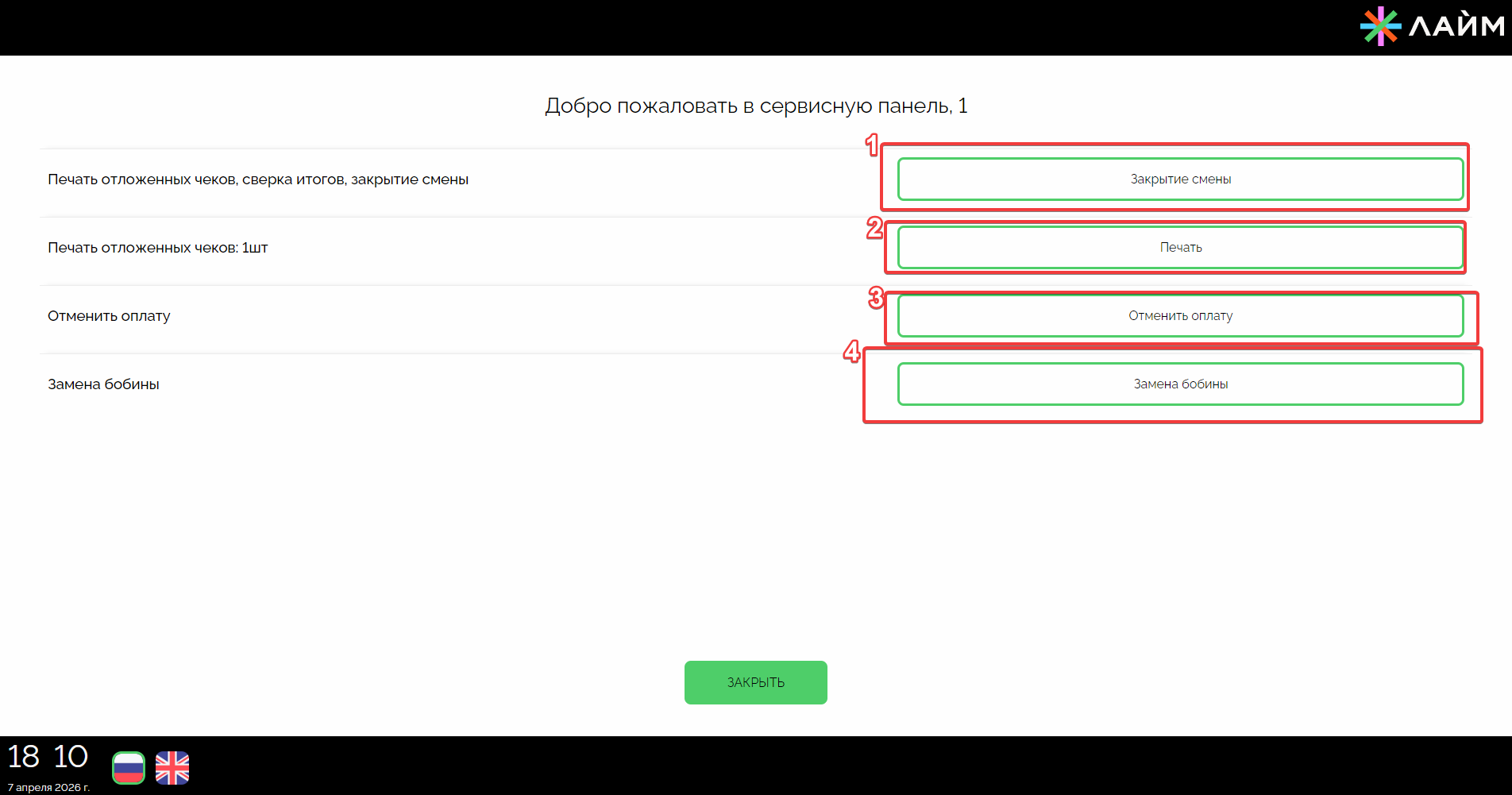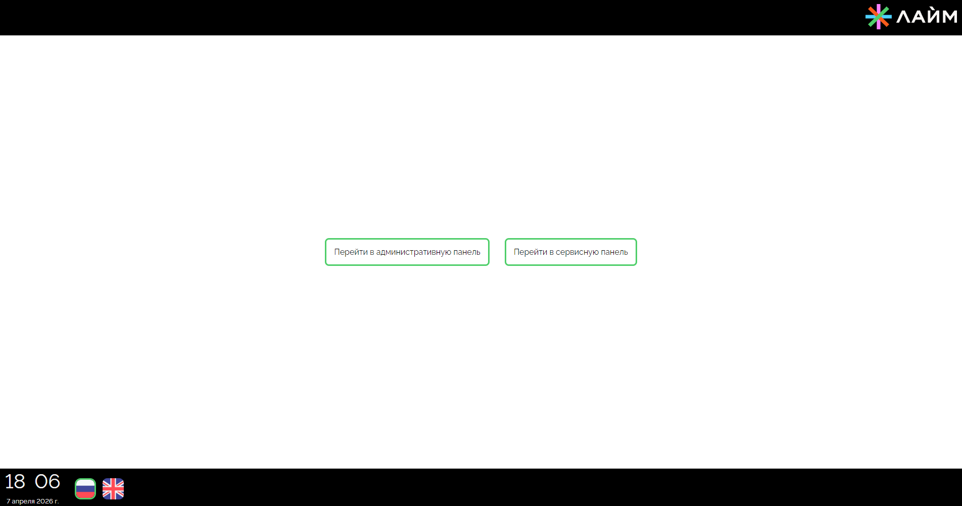 Для входа в режим администратора необходимо 7 раз кликнуть на логотипе «Лайм» в правом нижнем углу приложения, после чего ввести пин код, заданный во время настройки: