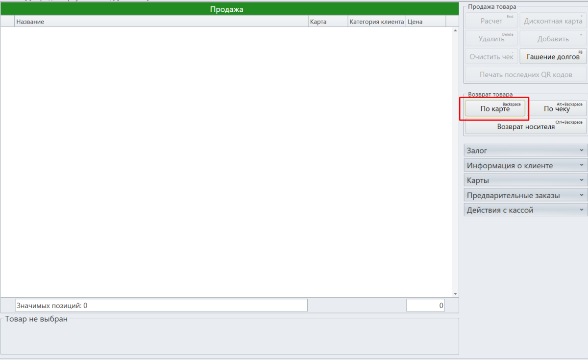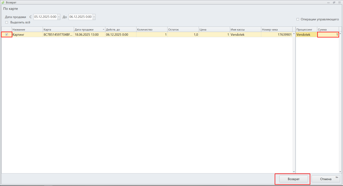 Далее нужно выбрать товар, сумму и нажать «Возврат».