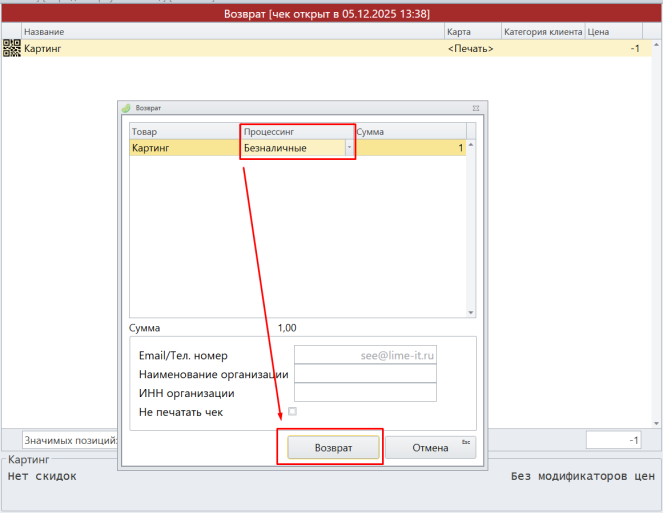 Далее нужно нажать «Возврат» и откроется окно где нужно будет выбрать процессинг и нажать «Возврат»