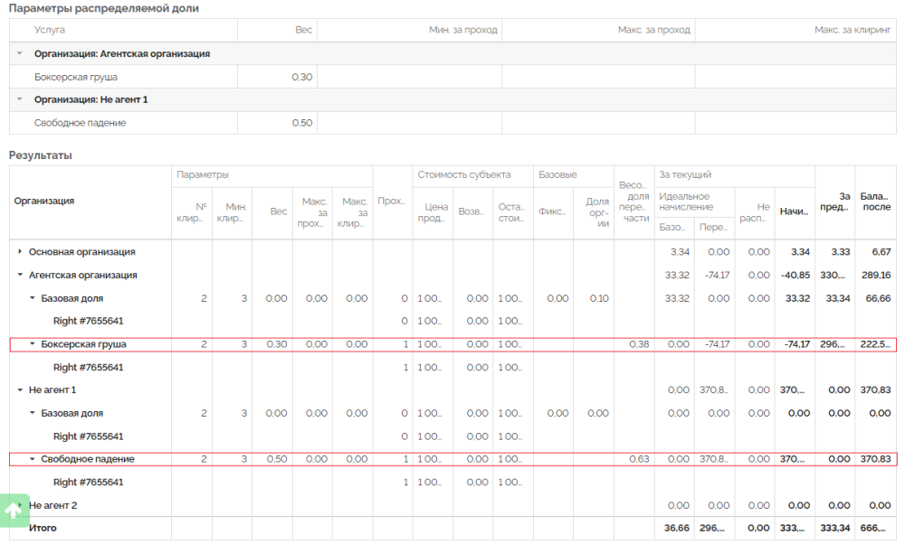 Первая таблица будет аналогична предыдущим, поэтому смотрим сразу нижние. Как и при предыдущих клирингах основная организация получила свои +10р/3, а агентская +1000р*0,1/3. Но распределяемая часть (переменный бюджет) поделена между тремя организациями. При этом весовые доли переменной части у их услуг переопределяются следующим образом: